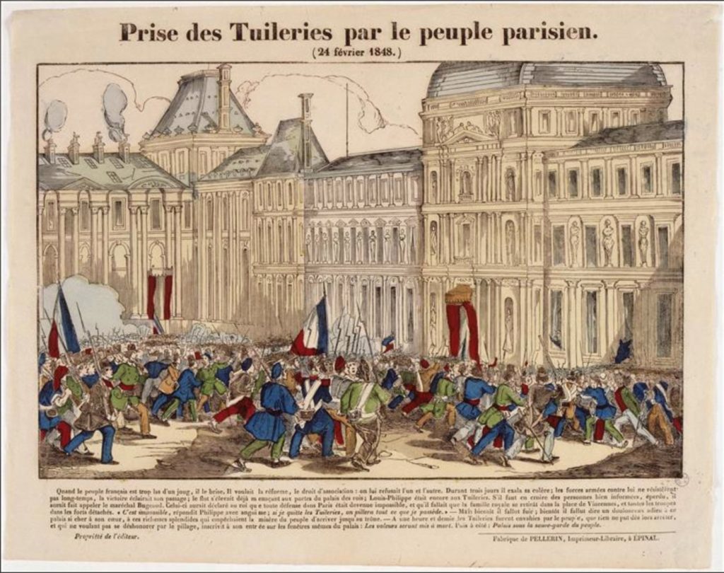 Entre 1830 et 1842, de nombreuses grèves ont lieu. C’est en 1840 que les grèves sont le plus nombreuses, le petit peuple demande une augmentation de salaire, une baisse du temps de travail à 12 heures par jour et une baisse du prix du pain. La tension grandit et en 1847 une nouvelle crise économique fait exploser le prix du pain. Le peuple est affamé, et c’est la révolte en février 1848. En trois jours, les 22, 23 et 24 février, cette révolte contraint le roi Louis Philippe à abdiquer. (À ne pas confondre avec les Trois Glorieuses, 27, 28 et 29 juillet 1830).